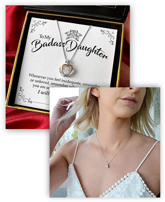 Remind your daughter of the BADASS she truly is! This gorgeous gift set celebrates her strength and uniqueness with a stunning high quality two-tone 925 sterling silver crown necklace. The elegant and dainty crown pendant features a glimmering cubic zirconia center crystal so she can shine like a queen!